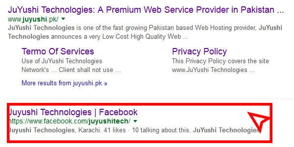 Facebook page ranking spot #2 on Google search for “JuYushi Technologies”